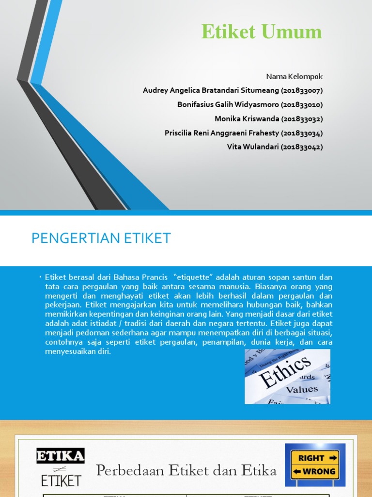 Etiket berasal dari bahasa prancis yaitu etiquette yang bermakna kartu undangan kerajaan.menurut kamus besar bahasa indonesia, etiket memiliki pengertian yaitu sopan santun. Bisa lebih dari satu, contoh: Pengertian etiket etiket berasal dari bahasa perancis yaitu etiquette yang artinya sopan santun. Sesuatu dimana dan bagaimana cabang utama filsafat yang mempelajari nilai atau kualitas Selain etik dan etika ada sebuah kata lain yang berdekatan yaitu etiket.